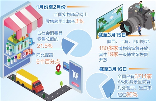 统计数据显示,1月份至2月份,全国实物商品网上零售额同比增长3%,占社会消费品零售总额的比重为21.5%,同比提高5个百分点。新型消费将成为我国经济发展新动能。