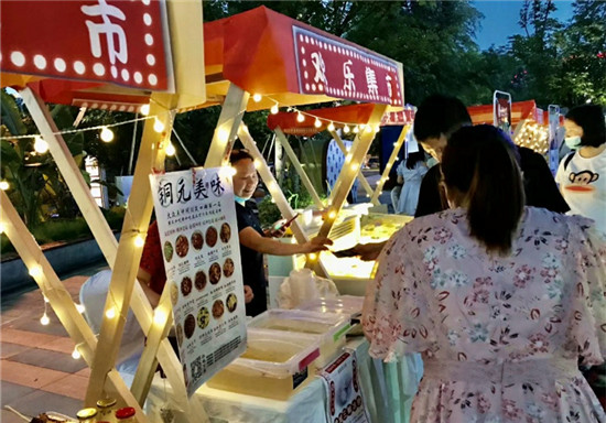 金辉城铜元道是园区内三大商业载体之一,这里主要以餐饮、娱乐为主要经营业态。为尽早恢复往日繁荣,4月10日起,南滨路管委会携手铜元道开展夜间创意集市。每天晚6点开市,10点闭市,免费摊位100余个,直接带动近300人就业增收。