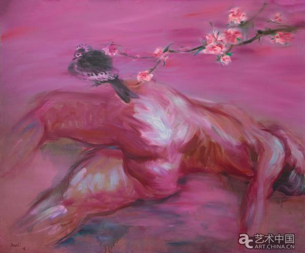 她这次展出的作品还是原来那几个系列的延续。比如:人物、静物、花鸟等。只是有一些作品是第一次公开展示,例如她将鸟与人物组合在一起的作品。这组作品中整个画面出现了耐人寻味的暧昧场景:红色的主调表现出的女人的身体欲望,她们面对着一只奇怪的鸟,那鸟有着八大山人般的半痴半傻,整个场景充满了说不清的情色,也许艺术家是想通过这样的作品来表现和批判都市社会的物欲横流。